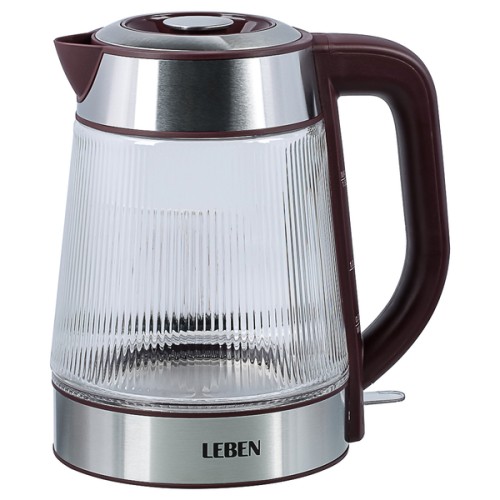 LEBEN Электрический чайник из рифленого стекла 1,8 л – элегантное решение для современной кухни, где важны и функциональность, и эстетика. Бордовый корпус из прочного стекла с оригинальной текстурой придает прибору благородный вид, превращая процесс кипячения воды в визуально приятное действие. Модель сочетает в себе передовые технологии и продуманную эргономику. Интеграция скрытого нагревательного элемента обеспечивает не только быстрый нагрев, но и простоту в уходе, исключая проблему накипи. Конструкция с поворотным механизмом на 360 градусов делает использование максимально удобным, позволяя устанавливать чайник в любом положении на столешнице.