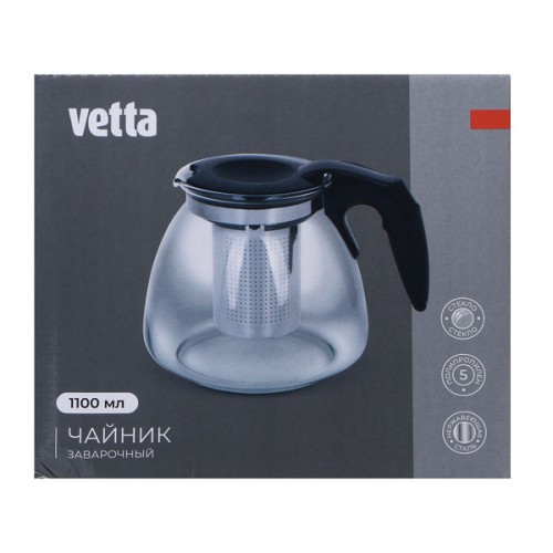 Заварочный чайник VETTA, объем 1100 мл с ситечком из нержавеющей стали – прекрасное решение для повседневного чаепития. Имеет увеличенный объем, поэтому подходит для семьи и большой компании. Его можно использовать как для приготовления густой заварки для последующего разбавления водой, так и для полностью готовых напитков для разливания в чашки. Ситечко из нержавеющей стали эффективно отфильтровывает мелкие частички заварки и не искажает вкус напитка.