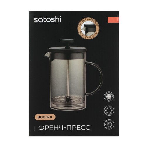 Френч-пресс SATOSHI «Графит» подходит для заваривания чая и кофе. Колба выполнена из жаропрочного стекла с легким затемнением, что придает изделию оригинальный вид и в то же время позволяет наслаждаться красотой напитка. Пластиковая крышка плотно прилегает, снижая теплопотери. Поршень с фильтром из нержавеющей стали не подвержен коррозии и не изменяет вкус напитка, а также эффективно отфильтровывает частички чая или кофе. А носик с фильтром создает дополнительную защиту от попадания взвеси и осадка в чашку.