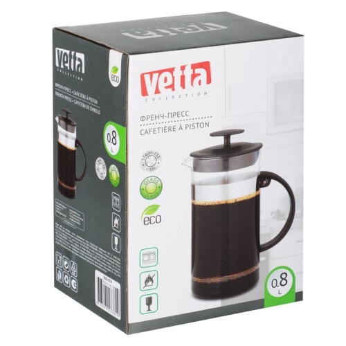 Френч-пресс из жаропрочного стекла 800 мл. Колба выполнена из термостойкого стекла, сохраняющего тепло и аромат напитка. Фильтрующий поршень из нержавеющей стали обеспечивает чистое и плавное прессование без попадания гущи. Корпус дополнен ненагревающимися крышкой и ручкой для безопасного использования. Модель оснащена удобным отверстием для слива. Устройство полностью разбирается и подходит для мытья в посудомоечной машине.