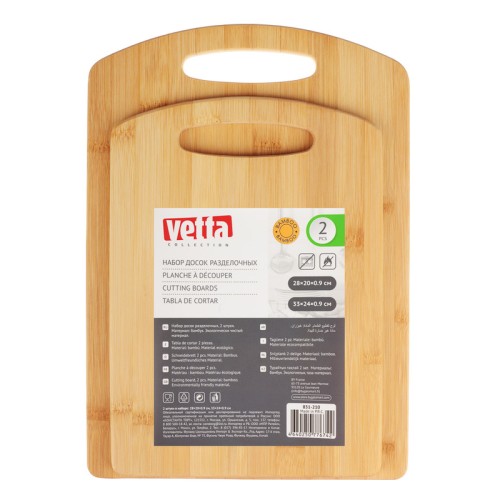 Набор разделочных досок VETTA «Гринвуд» – это 2 разделочные доски из бамбука с размерами 28х20х0,9 см и 33х24х0,9 см. Подходят для разделки, шинковки и нарезки любых продуктов: мяса, закусок, овощей. Доски идеально ровные, не скользят по столешнице, комфортные в использовании. Бамбук обладает высокой плотностью, поэтому поверхность досок устойчива к деформации и износу от ножей.