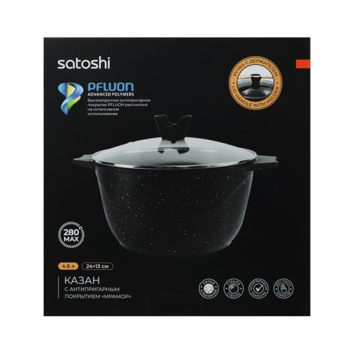 Казан SATOSHI «Монфор» размером 24х13 см и объемом 4,8 л из литого алюминия со стеклянной крышкой с пароотводом – это качественная долговечная посуда для приготовления блюд методом тушения и длительного томления. Высокопрочное безопасное антипригарное покрытие PFLUON под «мрамор» на водной основе без PFOA рассчитано на интенсивное использование и выдерживает длительный нагрев до 280 градусов. Оптимальная толщина стенок обеспечивает быстрый нагрев и равномерное приготовление. Ручка на крышке с покрытием soft-touch с держателем может использоваться как подставка для столовых приборов. Казан можно использовать в духовке без крышки.