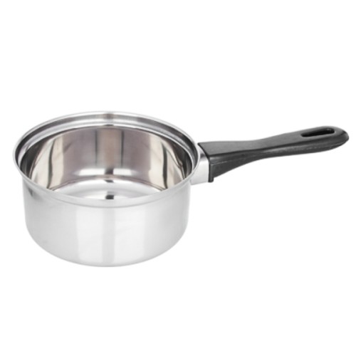 Ковш диаметром 14 см из нержавеющей стали с черной бакелитовой ручкой.