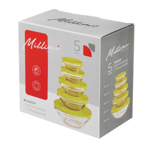 В набор входят салатники самых востребованных объемов: 130 мл (для соусов и меда), 200 мл (для порции салата или ягод), 350 мл (для гарниров), 500 мл (для салатов на компанию) и большой контейнер на 900 мл (для объемных блюд и маринадов). Чаши изготовлены из прочного стекла, не впитывают запахи и жиры, не мутнеют со временем и не выделяют вредных веществ. Яркие крышки из пищевого пластика надежно защищают содержимое от протекания и посторонних запахов .