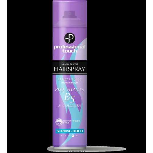 Лак для волос сильной фиксации «Pro vitamin B5 & Collagen» с усиленным витаминным комплексом провитамина В5 и коллагеном придаёт волосам воздушный объём и упругость. Естественная укладка, сохраняет форму после расчесывания. Формула лака Professional Touch обеспечивает динамичную фиксацию, контролируя укладку надолго. Волосы легко и быстро моделировать руками или утюжком. Эффективная защита от УФ-агрессии солнечных лучей. Защита от ветра и влаги. Идеально подходит для волос всех типов. Придает дополнительный объем, улучшает структуру окрашенных, тонких, поврежденных и ослабленных волос.