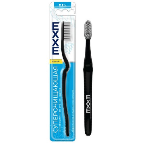 Зубная щетка ЕХХЕ средней жесткости. Эксклюзивная эргономичная форма ручки в сочетании с ультра-деликатными отполированными щетинами помогает добиться эффекта всесторонней чистки полости рта.